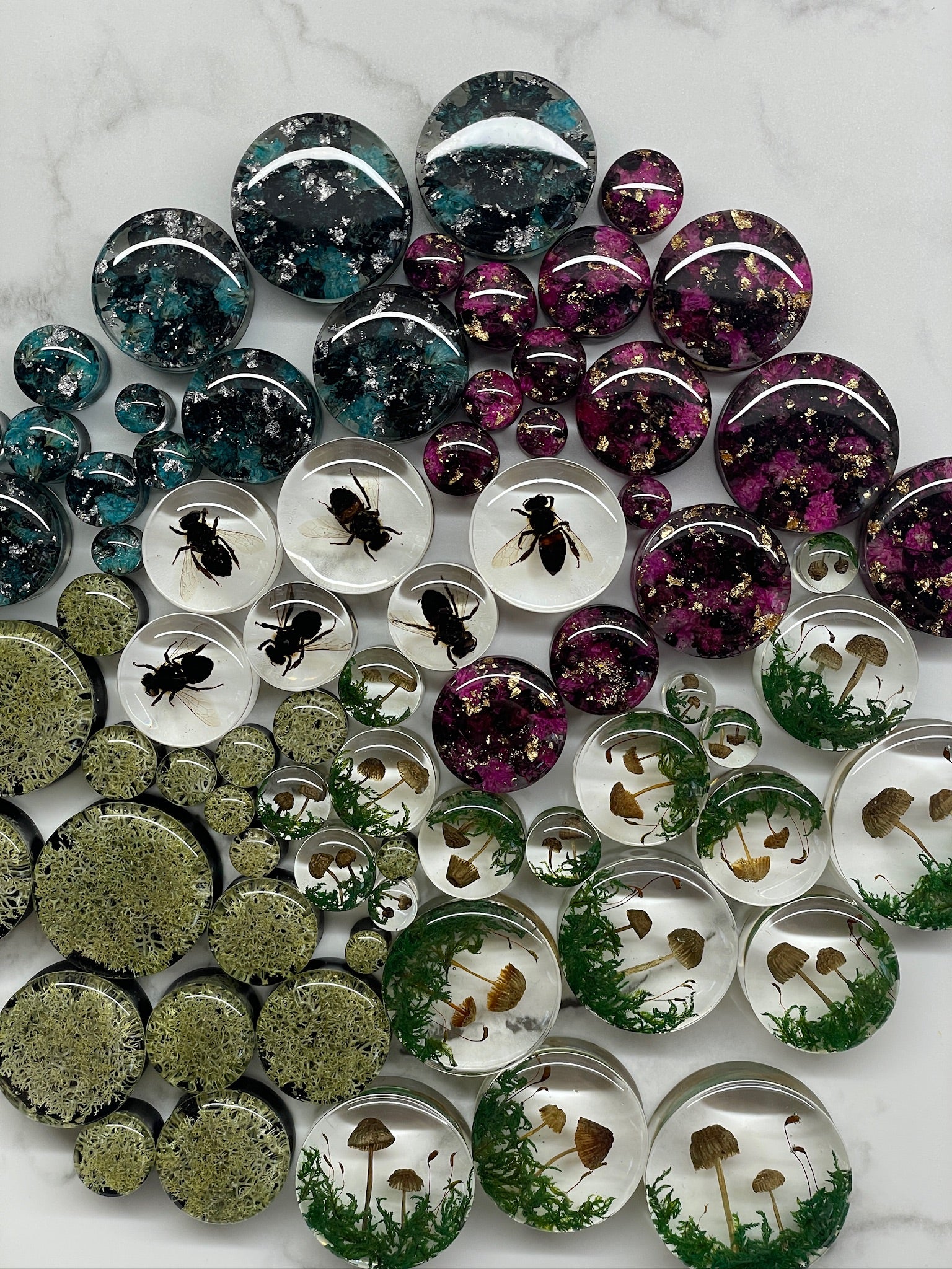 Everything here is handmade with love, from gauges to rings to earrings. Here you can find accessories for everyday wear and also for special occasions! Please note that all plugs are handmade and might be slightly different. All the bugs, flies and insects I use in my work have died naturally!